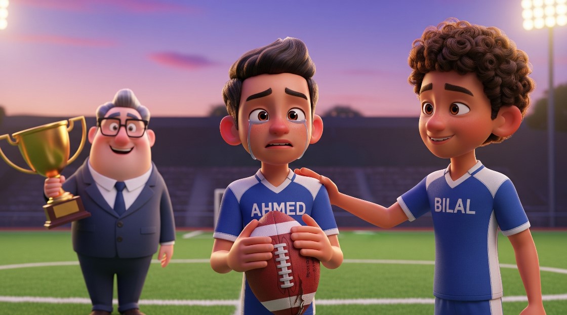 One day, the final football match was held. Ahmed played with all his energy, and in the last minutes, he took a powerful shot towards the goal. The ball slightly touched Bilal before going into the net. The referee recorded the goal under Bilal’s name, and the school awarded him “Best Player.”