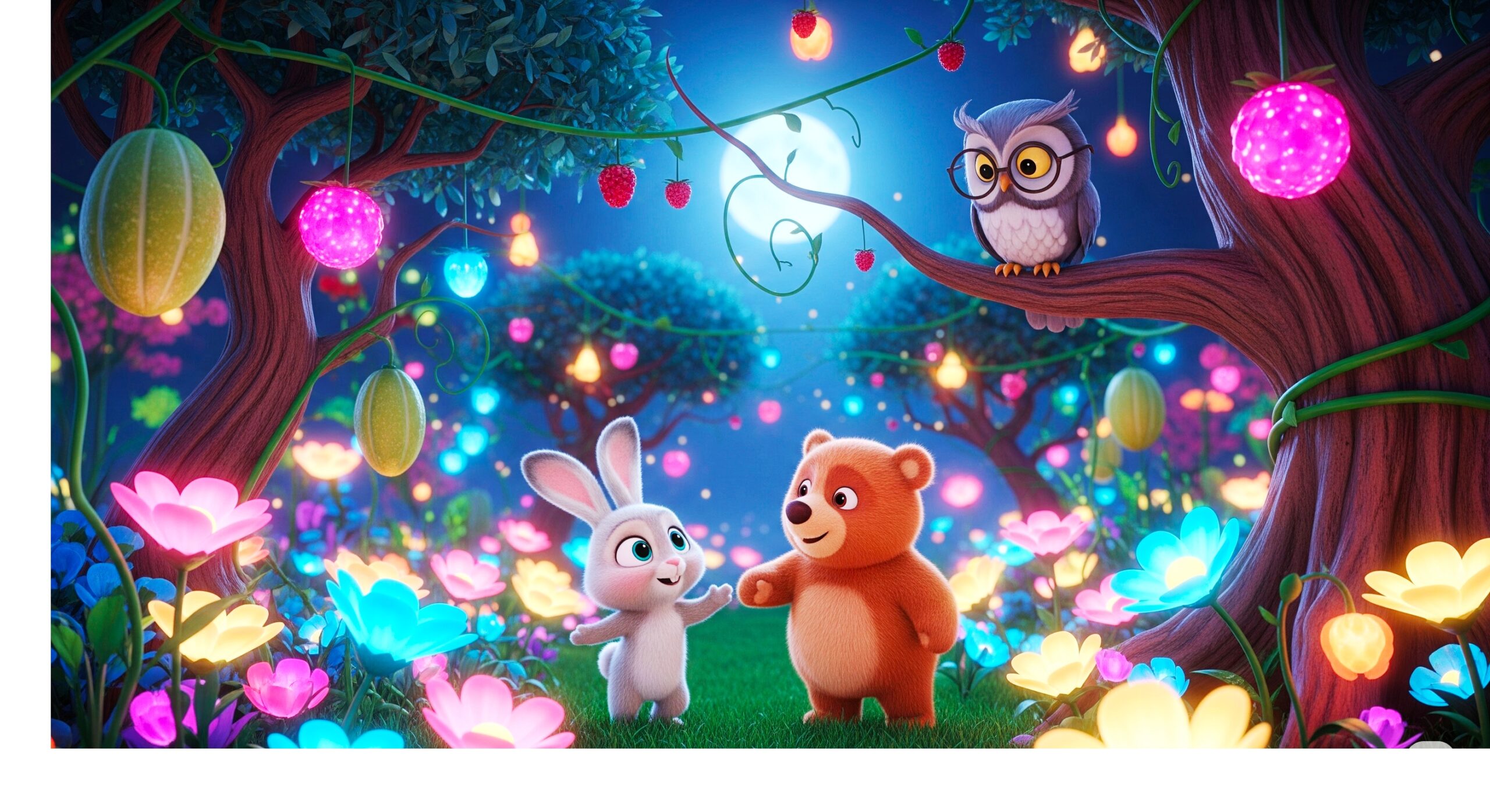Ruffy loved colorful flowers, while Bobo loved sweet fruits. One night, as they sat under the moonlight, Ruffy whispered,